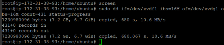 sudo dd if=/dev/xvdf1 ibs=16M of=/dev/xvdg1 obs=16M count=431 status=progress