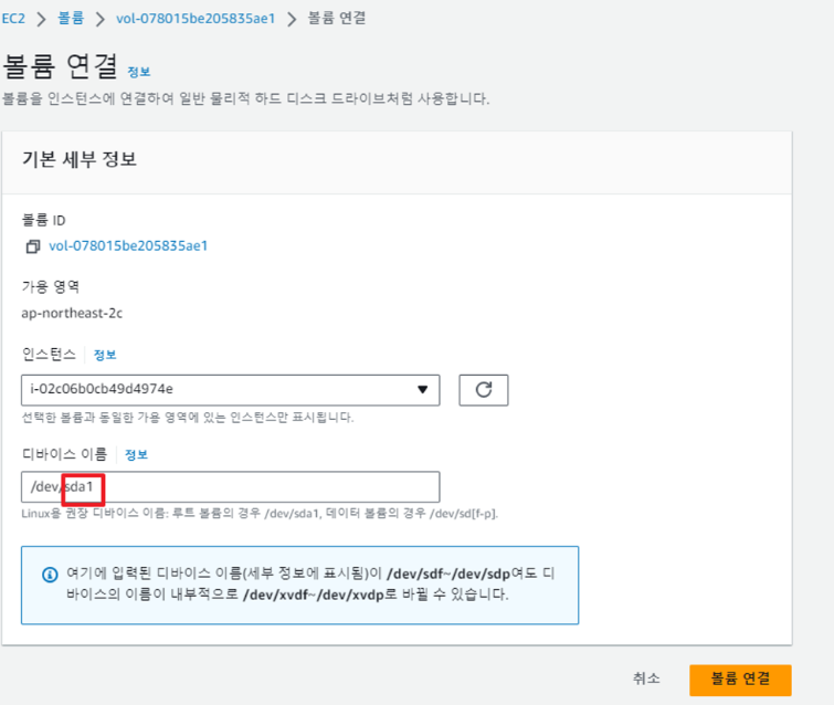 볼륨 연결 시 부팅 볼륨 (루트 디바이스)로 마운트 되어야 하기 때문에, sda1으로 작성했다.